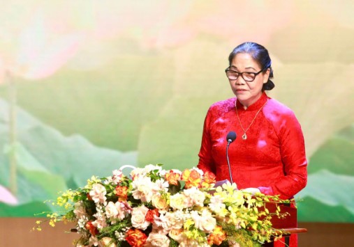 Đồng chí Nguyễn Thị Bích Thủy, Trưởng ban Quản lý di tích Nhà tù Hỏa Lò tham luận. Ảnh: Viết Thành.