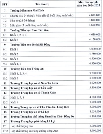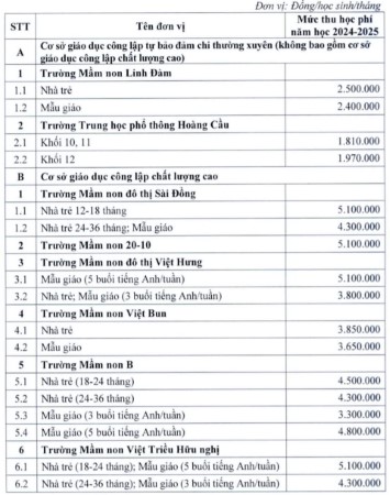 Cụ thể quy định về mức thu học phí đối với các cơ sở giáo dục mầm non, giáo dục phổ thông công lập tự bảo đảm chi thường xuyên; cơ sở giáo dục mầm non, giáo dục phổ thông công lập chất lượng cao của thành phố Hà Nội năm học 2024-2025.