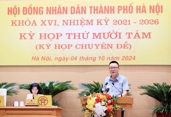 Phó Trưởng ban Văn hóa-Xã hội HĐND Thành phố Nguyễn Quang Thắng trình bày báo cáo thẩm tra