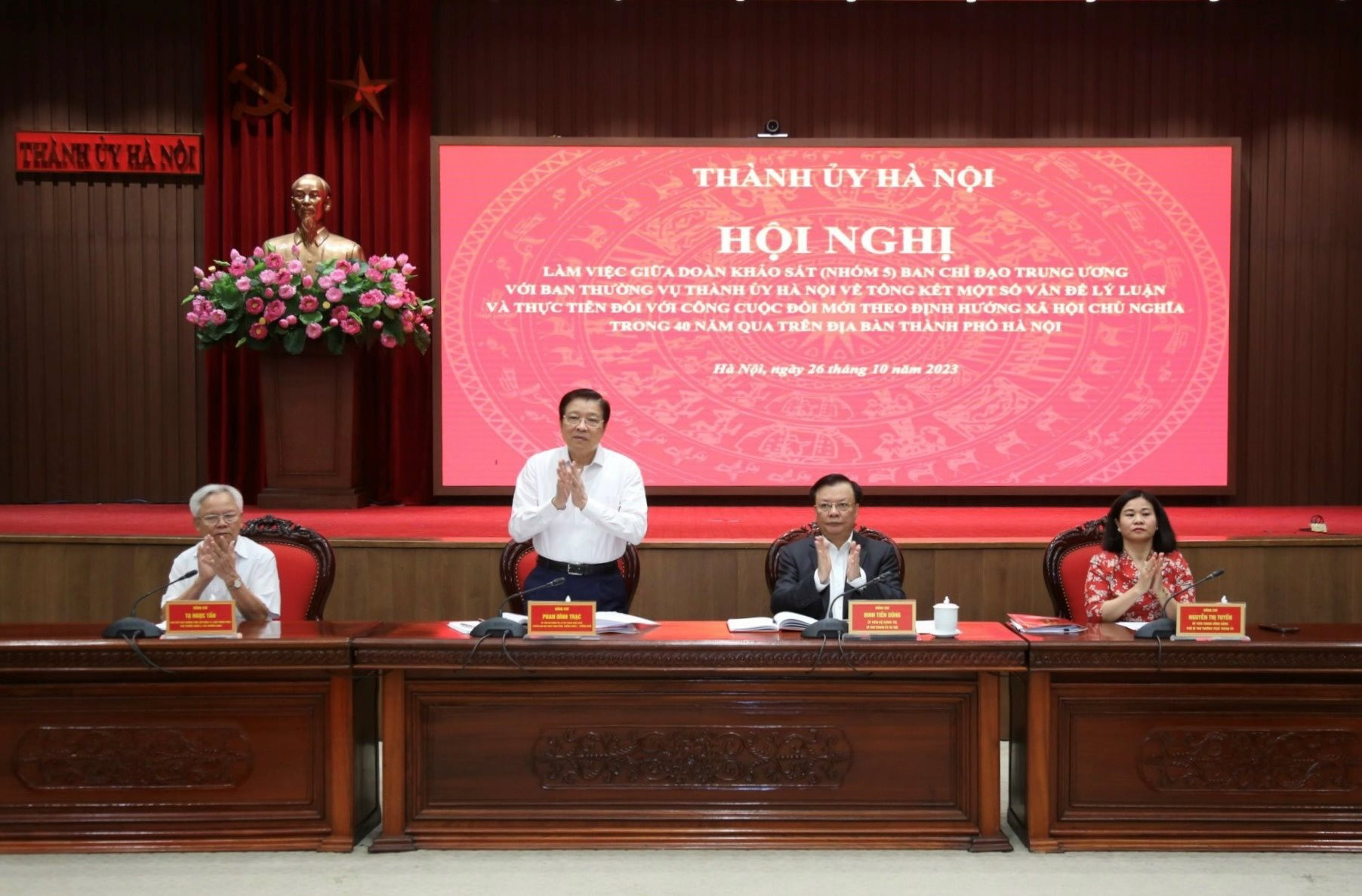 Phát biểu mở đầu, đồng chí Phan Đình Trạc cho biết, thực hiện kế hoạch của Ban Chỉ đạo tổng kết 40 năm đổi mới, Đoàn khảo sát của nhóm 5 tiến hành khảo sát tại Hà Nội nhằm làm rõ một số vấn đề lý luận và thực tiễn về xây dựng, chỉnh đốn Đảng về hệ thống chính trị, phòng, chống tham nhũng, tiêu cực trên địa bàn Hà Nội. Qua đó, góp phần bổ sung, hoàn thiện lý luận của Đảng về đường lối đổi mới, về chủ nghĩa xã hội và con đường đi lên chủ nghĩa xã hội ở Việt Nam, phục vụ tổng kết 40 năm đổi mới và xây dựng văn kiện Đại hội XIV của Đảng.
