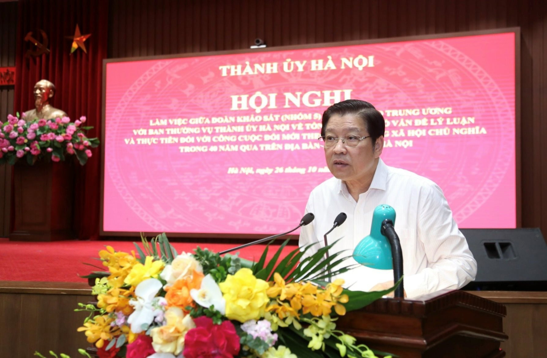 Sáng 26-10, tại trụ sở Thành ủy Hà Nội, Đoàn khảo sát (nhóm 5) Ban Chỉ đạo Trung ương Tổng kết một số vấn đề lý luận và thực tiễn về công cuộc đổi mới theo định hướng xã hội chủ nghĩa ở Việt Nam trong 40 năm qua và Ban Thường vụ Thành ủy Hà Nội tổ chức hội nghị làm việc về các vấn đề liên quan.