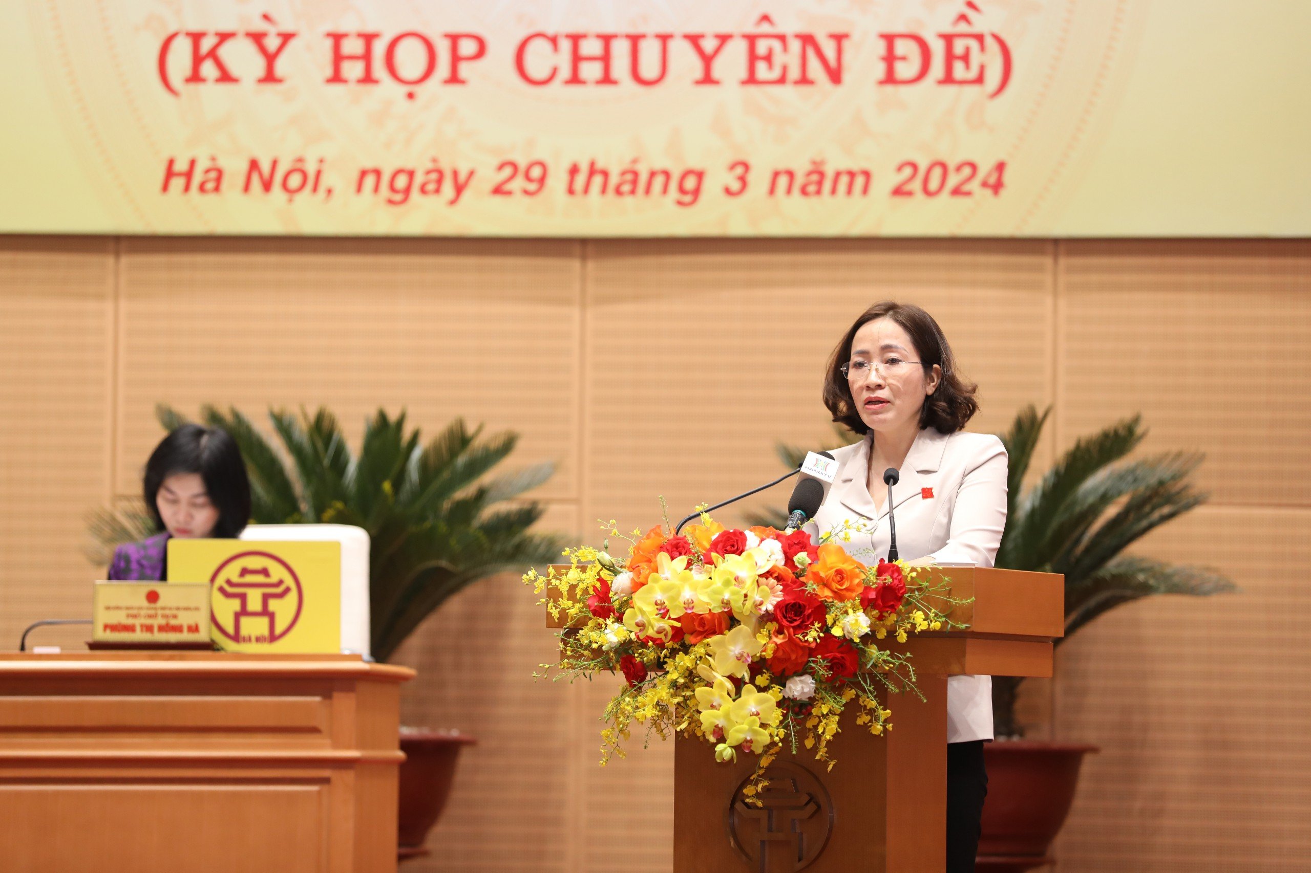 Phó Trưởng ban Pháp chế HĐND Thành phố Hoàng Thị Thuý Hằng trình bày báo cáo thẩm tra nghị quyết