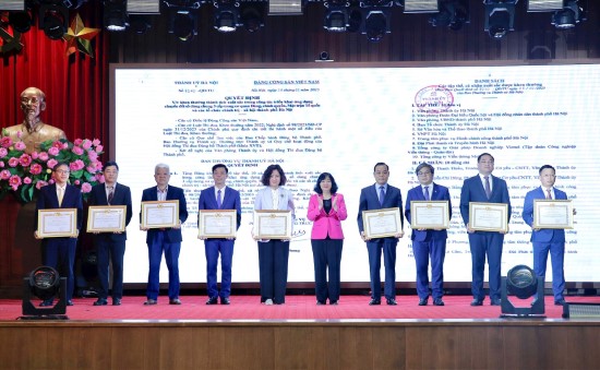 Bí thư Thành ủy Hà Nội Bùi Thị Minh Hoài trao Bằng khen của Ban Thường vụ Thành ủy Hà Nội tặng các tập thể có thành tích xuất sắc. Ảnh: Viết Thành