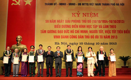 Sáng 10/10, HĐND, UBND, UB MTTQ Thành phố Hà Nội đã trang trọng tổ chức Lễ kỷ niệm 59 năm Ngày Giải phóng Thủ đô (10/10/1954- 10/10/2013), biểu dương điển hình trong học tập và làm theo tấm gương đạo đức Hồ Chí Minh, biểu dương Người tốt việc tốt và trao tặng danh hiệu Công dân Thủ đô ưu tú tại Cung văn hóa hữu nghị Việt Xô.