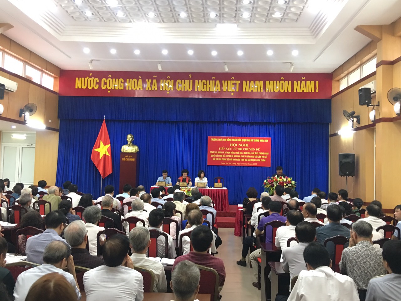 Ngày 23/4/2019, thực hiện Luật Tổ chức chính quyền đại phương năm 2015, Chương trình công tác năm 2019. Thường trực HĐND quận Hai Bà Trưng phối hợp cùng UBND, Ủy ban MTTQ quận tổ chức Hội nghị tiếp xúc cử tri chuyên đề về “Công tác quản lý, ký hợp đồng thuê nhà, mua nhà, cấp giấy chứng nhận quyền sử dụng đất, quyền sở hữu nhà ở và tài sản khác gắn liền với đất đối với nhà thuộc sở hữu Nhà nước trên địa bàn quận Hai Bà Trưng”.