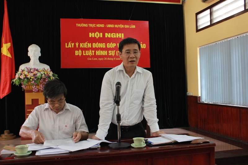 Trong thời gian qua, các cơ quan, đơn vị trên địa bàn huyện Gia Lâm đã tổ chức nhiều hình thức lấy ý kiến đóng góp vào dự thảo BLHS. UBND các xã, thị trấn, các cơ quan, ban ngành, đoàn thể cũng đã tổ chức các hội nghị lấy ý kiến đóng góp của cử tri, nhân dân, cán bộ, các chuyên gia, nhà nghiên cứu… Trong đó, ngày 26/8/2015, Thường trực HĐND huyện đã phối hợp với UBND tổ chức Hội nghị lấy ý kiến đóng góp vào Dự thảo BLHS (sửa đổi), thành phần gồm: Thường trực HĐND, lãnh đạo UBND, UBMTTQ huyện, Trưởng các phòng, ban, ngành, đoàn thể thuộc Huyện, Thường trực HĐND, lãnh đạo UBND các xã, thị trấn. Chiều ngày 28/8, Ủy ban MTTQ huyện cũng đã tổ chức Hội nghị đóng góp ý kiến vào dự thảo Bộ luật Hình sự (sửa đổi)…