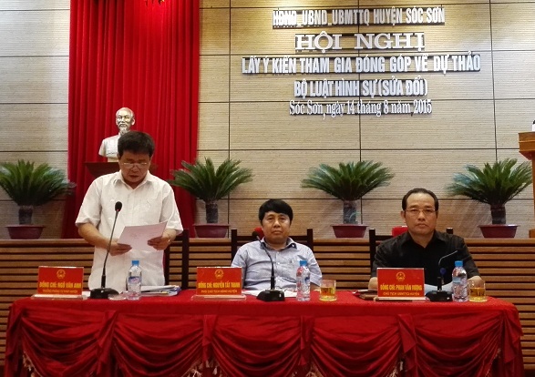 Thực hiện Kế hoạch số 10/KH-HĐND ngày 24/7/2015 của HĐND thành phố Hà Nội về việc tổ chức lấy ý kiến nhân dân thành phố Hà Nội về dự thảo Bộ luật Hình sự (sửa đổi) và theo Kế hoạch số 532/KH-HĐND ngày 03/8/2015 của HĐND huyện Sóc Sơn về việc tổ chức lấy ý kiến nhân dân trên địa bàn huyện Sóc Sơn vào Dự thảo Bộ luật Hình sự (sửa đổi); ngày 14/8/2015, Thường trực HĐND huyện phối hợp với UBND, Uỷ ban MTTQ huyện tổ chức Hội nghị lấy ý kiến tham gia đóng góp vào dự thảo Bộ luật Hình sự (sửa đổi).