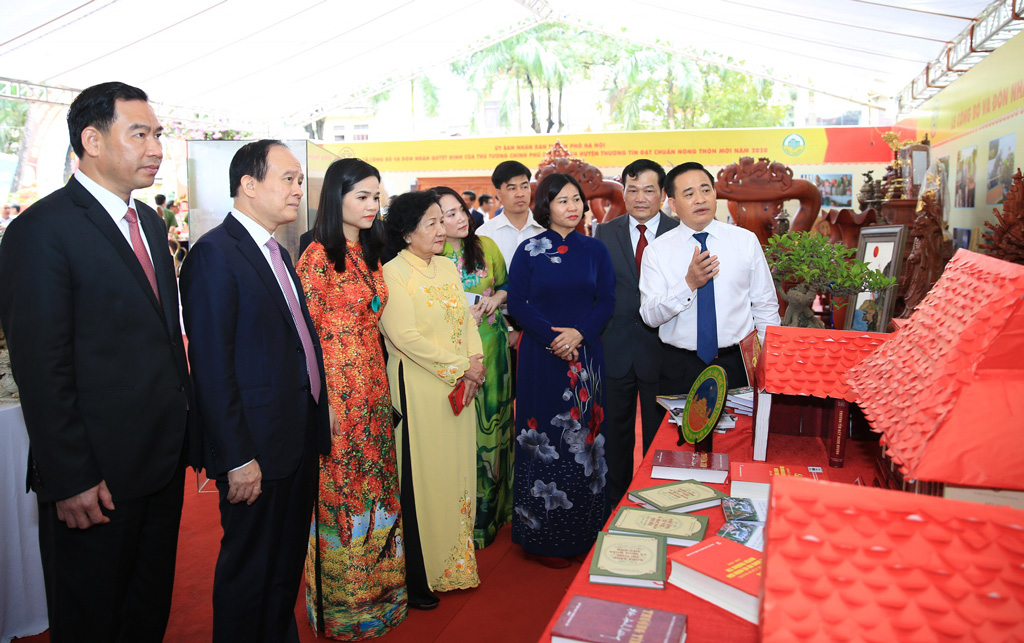 Phó Bí thư Thường trực Thành ủy Hà Nội Nguyễn Thị Tuyến, Chủ tịch HĐND thành phố Hà Nội Nguyễn Ngọc Tuấn cùng các đại biểu tham quan gian trưng bày sản phẩm làng nghề, OCOP.