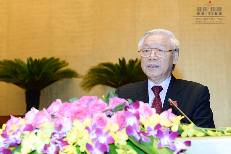 Tổng Bí thư nhấn mạnh, yêu cầu xây dựng và bảo vệ Tổ quốc trong giai đoạn mới đang đặt ra trước Quốc hội và các vị đại biểu Quốc hội khóa XIV những nhiệm vụ rất nặng nề và cao cả. Cử tri cả nước đang kỳ vọng Quốc hội khóa mới sẽ kế thừa, phát huy những thành quả của Quốc hội các khóa trước, tiếp tục có nhiều giải pháp đột phá, đổi mới nội dung và phương thức hoạt động để nâng cao hơn nữa hiệu lực, hiệu quả hoạt động. Đảng Cộng sản Việt Nam, với vai trò lãnh đạo Nhà nước và xã hội, theo trách nhiệm và quyền hạn được Hiến pháp quy định, đã, đang và sẽ tiếp tục chăm lo xây dựng Nhà nước thực sự của nhân dân, do nhân dân và vì nhân dân. Tổng Bí thư tin tưởng rằng, Quốc hội khóa XIV với tinh thần dân chủ, đoàn kết và trách nhiệm sẽ thực hiện thành công sứ mệnh của mình, tiếp tục ghi thêm mốc son mới vào lịch sử vẻ vang và tiến trình phát triển của Quốc hội Việt Nam