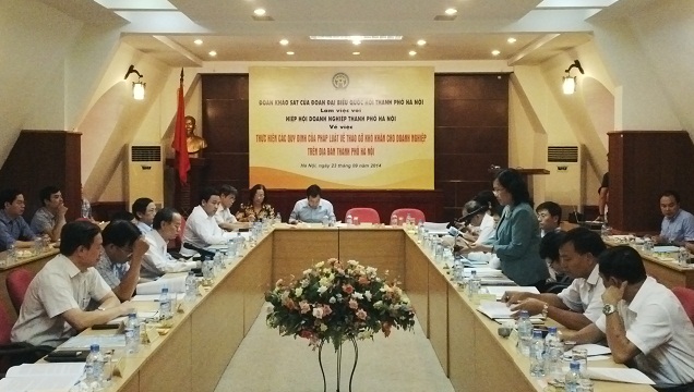 Ngày 23/9, Đoàn ĐBQH thành phố Hà Nội đã khảo sát “Việc thực hiện các quy định của pháp luật về tháo gỡ khó khăn cho doanh nghiệp trên địa bàn thành phố Hà Nội từ năm 2013 đến tháng 8/2014”. Đoàn khảo sát do Đồng chí Nguyễn Thị Hồng Hà - Thành ủy viên, Phó Trưởng Đoàn ĐBQH Thành phố - làm Trưởng đoàn cùng sự tham gia của các vị ĐBQH trong Đoàn và đại diện các cơ quan có liên quan trên địa bàn Thành phố.