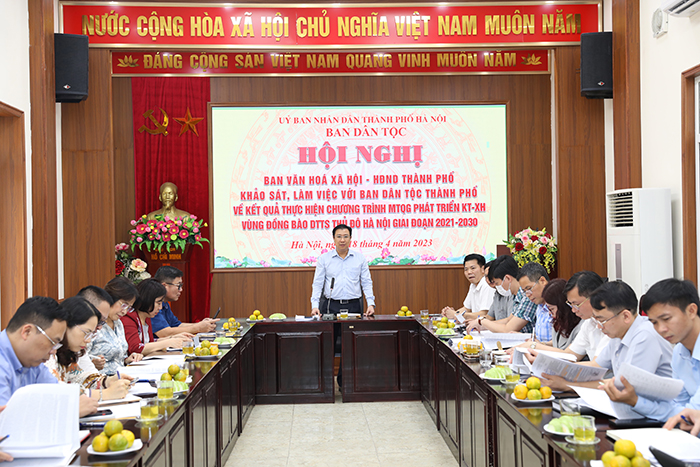 Sáng 18/4/2023, Đoàn khảo sát của Ban Văn hoá - Xã hội, HĐND thành phố Hà Nội đã làm việc với Ban Dân tộc Thành phố về kết quả thực hiện chương trình mục tiêu quốc gia phát triển kinh tế-xã hội vùng đồng bào dân tộc thiểu số Thủ đô Hà Nội giai đoạn 2021-2030.