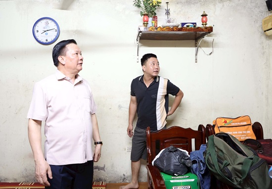 Bí thư Thành ủy Đinh Tiến Dũng kiểm tra hiện trạng căn hộ 101 D2, tập thể Ngọc Khánh, nơi 6 người sinh sống trong diện tích chỉ 28m2 đã xuống cấp nghiêm trọng.