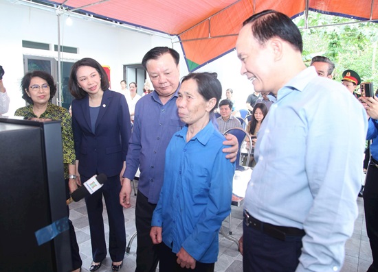 Các đồng chí lãnh đạo Trung ương và thành phố khánh thành nhà đại đoàn kết cho gia đình bà Hoàng Thị Quyết.