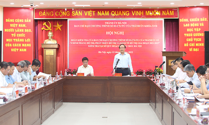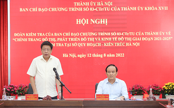 Chiều 12/8/2022, Đoàn kiểm tra số 1 của Ban Chỉ đạo Chương trình số 03-CTr/TU của Thành ủy Hà Nội (khóa XVII) về "Chỉnh trang đô thị, phát triển đô thị và kinh tế đô thị giai đoạn 2021-2025", do đồng chí Nguyễn Ngọc Tuấn, Phó Bí thư Thành ủy, Chủ tịch HĐND Thành phố, Trưởng ban Chỉ đạo làm Trưởng đoàn, đã làm việc với Sở Quy hoạch và Kiến trúc Hà Nội.