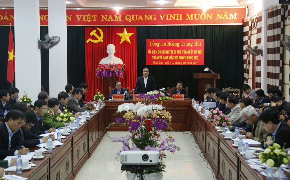 Sáng 7-2, đồng chí Hoàng Trung Hải, Ủy viên Bộ Chính trị, Bí thư Thành uỷ Hà Nội đã làm việc với Huyện ủy Phúc Thọ. Tham dự cuộc làm việc có các Ủy viên Ban Thường vụ Thành uỷ: Phó Chủ tịch Thường trực HĐND Thành phố Nguyễn Ngọc Tuấn, Phó Chủ tịch UBND Thành phố Lê Hồng Sơn; lãnh đạo các sở, ban, ngành Thành phố.