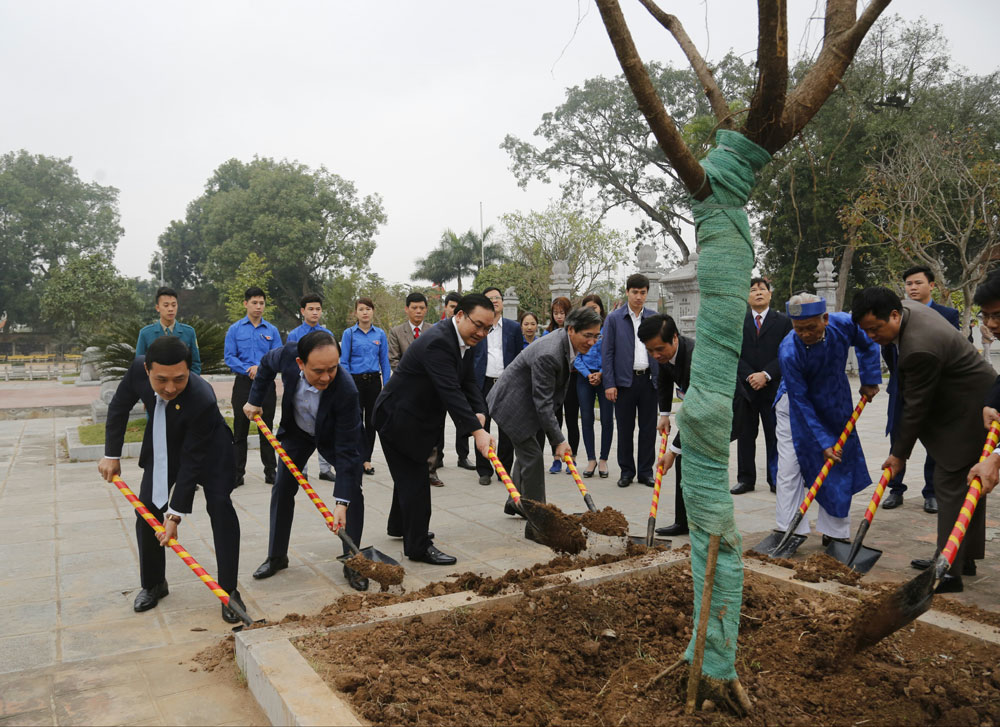 Đồng chí Bí thư Thành ủy, Phó Chủ tịch TT HĐND TP và lãnh đạo các cơ quan trồng cây lưu niệm tại Đền thờ Hai Bà Trưng - xã Hát Môn