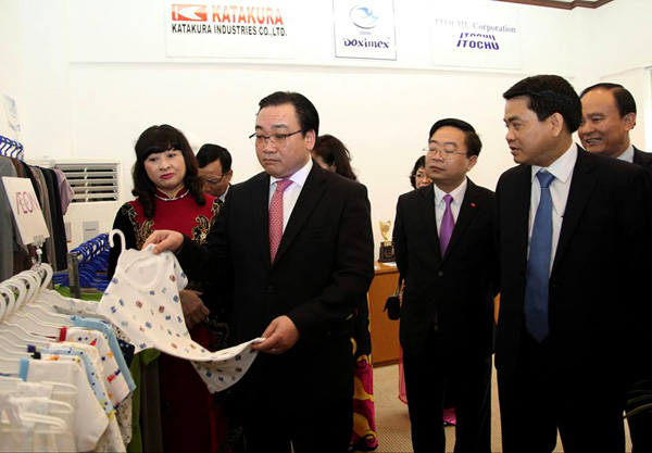 Bí thư Thành ủy Hoàng Trung Hải và các đồng chí lãnh đạo Thành phố thăm gian trưng bày sản phẩm của Công ty TNHH MTV Dệt kim Đông Xuân