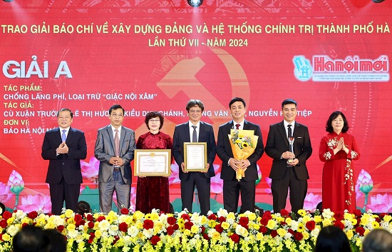Ủy viên Bộ Chính trị, Bí thư Thành ủy Hà Nội Bùi Thị Minh Hoài và Ủy viên Trung ương Đảng, Phó Trưởng ban Thường trực Ban Tuyên giáo và Dân vận Trung ương Lại Xuân Môn trao Giải A cho nhóm tác giả Cù Xuân Trường, Lê Thị Hương, Kiều Duy Chánh, Hoàng Văn Sơn, Nguyễn Hữu Tiệp của Báo Hànộimới. Ảnh: Viết Thành