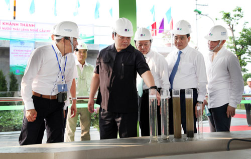 Bí thư Thành ủy Hà Nội Hoàng Trung Hải; Chủ tịch UBND TP Hà Nội Nguyễn Đức Chung thăm, kiểm tra dây chuyền xử lý nước thải tại Nhà máy Xử lý nước thải làng nghề Cầu Ngà (huyện Hoài Đức).