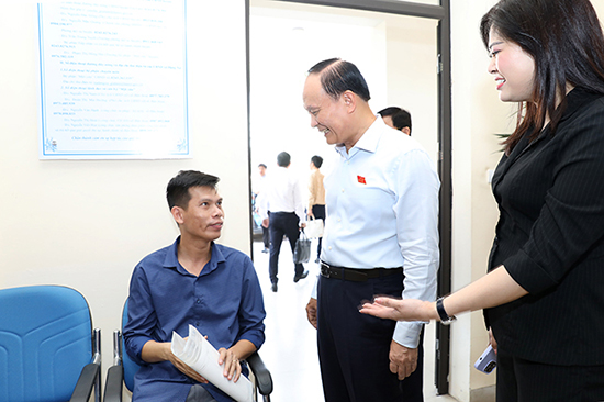 Chủ tịch HĐND Thành phố Nguyễn Ngọc Tuấn trò chuyện với người dân đến làm thủ tục hành chính tại bộ phận Một cửa xã Đặng Xá
