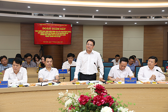 Báo cáo với Đoàn giám sát, Phó Chủ tịch UBND huyện Gia Lâm Nguyễn Đức Hồng cho biết, UBND huyện Gia Lâm xác định CCHC là nhiệm vụ trọng tâm xuyên suốt nhiệm kỳ. Từ đó, triển khai xây dựng các chương trình, kế hoạch, đề án đồng bộ và tổ chức quán triệt, tuyên truyền sâu rộng đến cán bộ, đảng viên, công chức, viên chức và nhân dân. Vai trò lãnh đạo, chỉ đạo của các cấp ủy đảng trong thực hiện nhiệm vụ công tác CCHC từng bước được nâng cao, nhận thức trong chỉ đạo, điều hành về công tác CCHC đã được cải thiện thông qua việc thực hiện chấm chỉ số CCHC đối với các đơn vị.