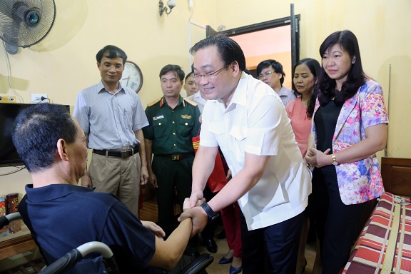 Bí thư Thành ủy Hoàng Trung Hải động viên thương binh 1/4 Hoàng Quốc Hùng, huyện Thanh Trì tại Trung tâm điều dưỡng người có công số 2 Hà Nội ngày 18/7/2016.