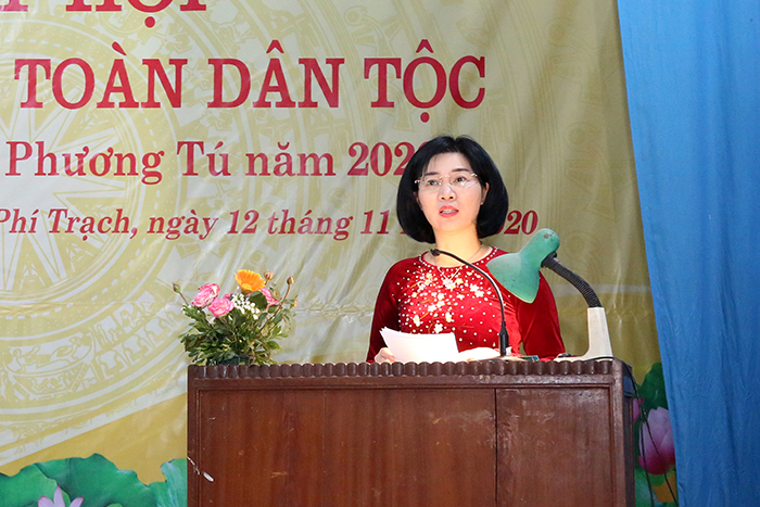 Bày tỏ vui mừng, đánh giá cao trước những kết quả Nhân dân thôn Phí Trạch, xã Phương Tú đã đạt được, đồng chí Phùng Thị Hồng Hà khẳng định: Ngày hội Đại đoàn kết hôm nay là dịp để nhắc nhở nhau cùng tiếp tục thực hiện tốt hơn nữa việc học tập và làm theo tấm gương đạo đức Hồ Chí Minh và những lời dạy của Người về đại đoàn kết toàn dân tộc; vì một mục tiêu chung là thực hiện thắng lợi các nhiệm vụ, mục tiêu của Xã, của Huyện và của Thành phố.