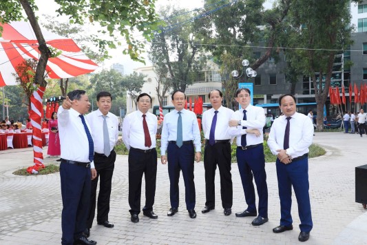 Lãnh đạo thành phố và quận Hai Bà Trưng thực hiện nghi thức gắn biển công trình