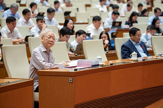 Sáng 9/6/2023, tiếp tục chương trình kỳ họp thứ năm, Quốc hội nghe báo cáo giải trình, tiếp thu, chỉnh lý dự thảo; kết quả lấy ý kiến nhân dân và báo cáo thẩm tra dự án Luật Đất đai (sửa đổi). Tổng Bí thư Nguyễn Phú Trọng, Thủ tướng Phạm Minh Chính, Thường trực Ban Bí thư - Trưởng ban Tổ chức Trung ương Trương Thị Mai tham dự phiên họp.