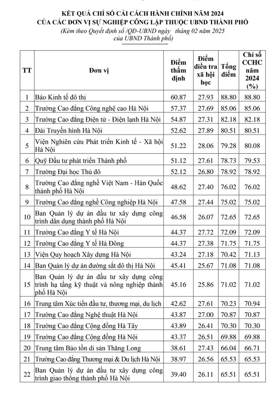 Về kết quả Chỉ số CCHC năm 2024 của các đơn vị sự nghiệp công lập thuộc UBND thành phố Hà Nội, dẫn đầu là Báo Kinh tế và Đô thị, đạt 88,8%; đứng cuối bảng là Ban Quản lý dự án đầu tư xây dựng công trình giao thông thành phố Hà Nội, đạt 65,51%.