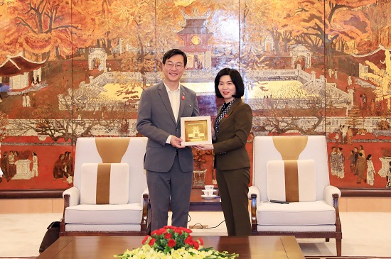 Phó Chủ tịch Thường trực HĐND thành phố Phùng Thị Hồng Hà và Ủy viên Quốc hội Hàn Quốc quận Dongdaemun (Thủ đô Seoul) Jang Kyungtae trao quà lưu niệm