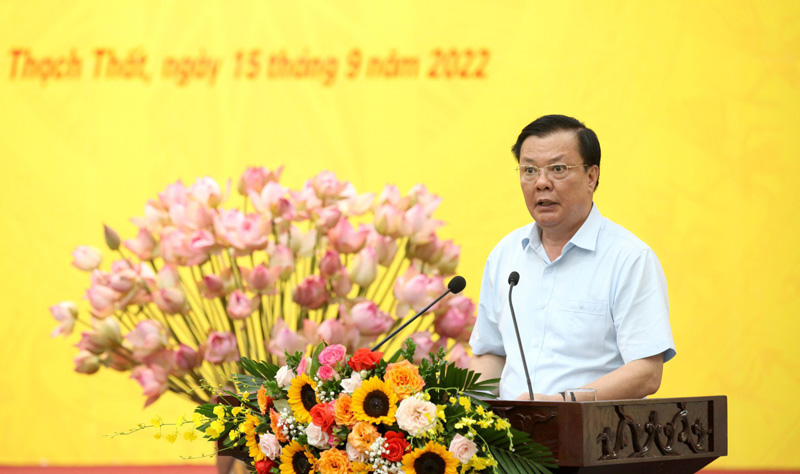 Nhấn mạnh một số nhiệm vụ trọng tâm cần thực hiện trong thời gian tới, Bí thư Thành ủy Đinh Tiến Dũng chỉ đạo các cơ quan, thành phố, các sở, ban, ngành quan tâm, phối hợp chặt chẽ và tạo điều kiện cho huyện Thạch Thất đầu tư phát triển hạ tầng kỹ thuật, xã hội, giao thông...