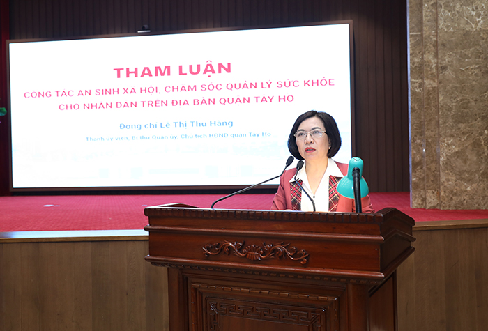 Bí thư Quận ủy, Chủ tịch HĐND quận Tây Hồ Lê Thị Thu Hằng tham luận tại hội nghị