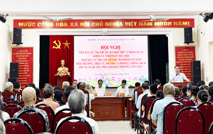 Ngày 25/6/2024, các đại biểu HĐND quận Tây Hồ (Hà Nội) tổ chức tiếp xúc với cử tri phường Yên Phụ trước kỳ họp thứ 15 HĐND quận khoá VI, nhiệm kỳ 2021 – 2026; tiếp xúc cử tri chuyên đề đảm bảo vệ sinh môi trường, trật tự đô thị, phòng chống dịch sốt xuất huyết trên địa bàn phường Yên Phụ.