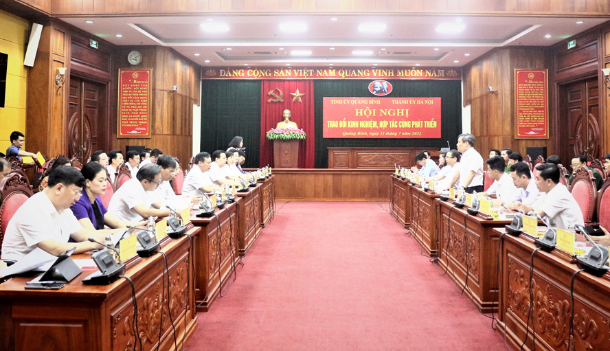 Sáng 11/7/2022, tại trụ sở Tỉnh ủy Quảng Bình, thành phố Hà Nội và tỉnh Quảng Bình phối hợp tổ chức Hội nghị trao đổi kinh nghiệm, hợp tác cùng phát triển.