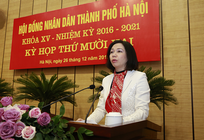 Giám đốc Sở Nội vụ Vũ Thu Hà trình bày Tờ trình của UBND Thành phố