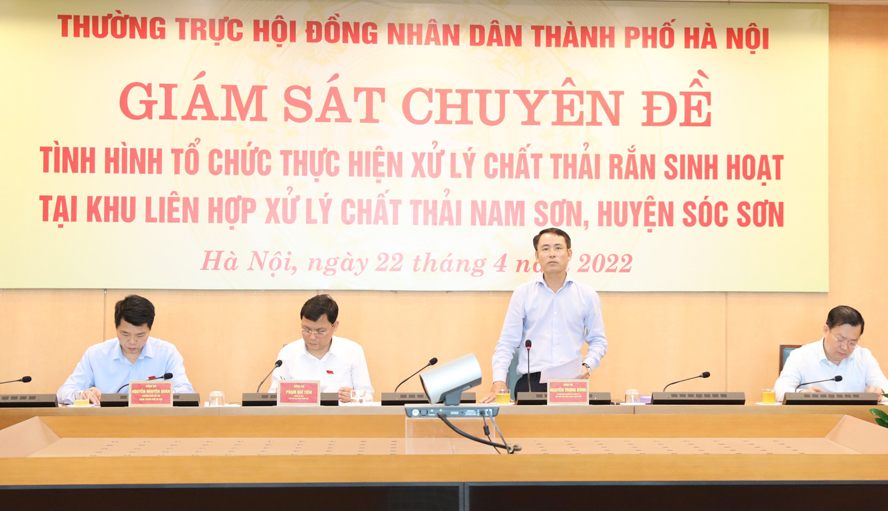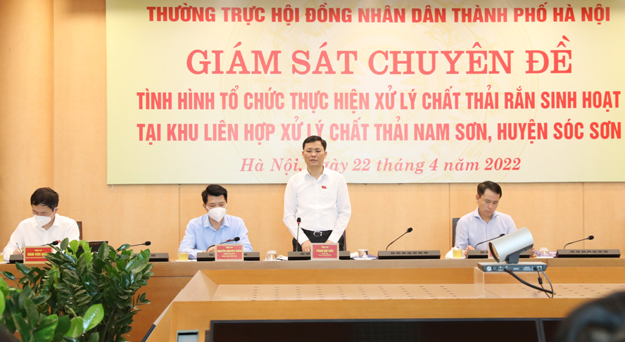 Sáng 22/4/2022, đoàn giám sát chuyên đề của Thường trực HĐND thành phố tiếp tục làm việc với UBND thành phố và các sở, ngành, đơn vị liên quan về tình hình tổ chức thực hiện xử lý chất thải rắn sinh hoạt tại Khu liên hợp xử lý chất thải Nam Sơn, huyện Sóc Sơn. Đồng chí Phạm Quí Tiên, Thành uỷ viên, Phó Chủ tịch HĐND thành phố, Trưởng đoàn giám sát chủ trì buổi làm việc.