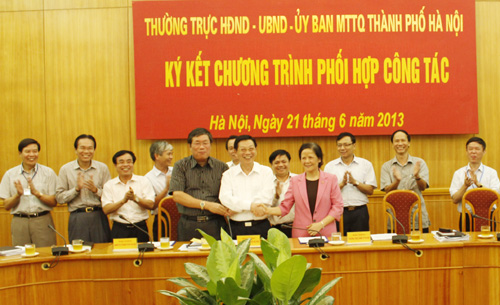 Thực hiện Đề án số 04/ĐA-TU ngày 19/10/2012 của Ban Thường vụ Thành ủy Hà Nội về “Nâng cao năng lực, hiệu lực, hiệu quả hoạt động của HĐND các cấp thành phố Hà Nội giai đoạn 2011 - 2016”, chiều 21/6, Thường trực HĐND - UBND - Ủy ban MTTQ TP Hà Nội đã ký kết Quy chế phối hợp giữa 3 cơ quan trong công tác tổ chức kỳ họp HĐND, công tác tiếp công dân, tiếp xúc cử tri và đôn đốc giải quyết đơn thư, kiến nghị của cử tri. Các đồng chí Ngô Thị Doãn Thanh, Ủy viên Trung ương Đảng, Chủ tịch HĐND TP; Nguyễn Thế Thảo, Ủy viên Trung ương Đảng, Chủ tịch UBND TP; Đào Văn Bình, Ủy viên Thường vụ Thành ủy, Chủ tịch Ủy ban MTTQ TP tham dự buổi lễ.