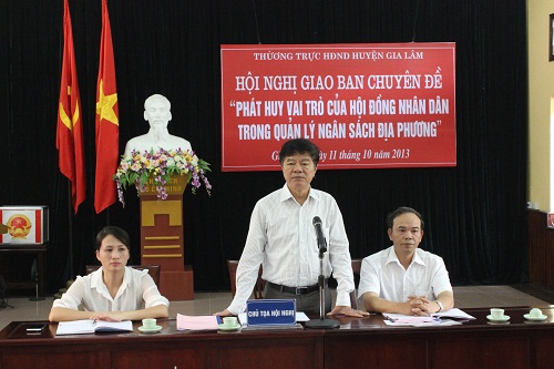 Sáng ngày 11/10, Thường trực HĐND huyện Gia Lâm đã tổ chức Hội nghị sơ kết hoạt động quý III, triển khai nhiệm vụ công tác quý IV năm 2013 và thảo luận chuyên đề “Phát huy vài trò của HĐND trong quản lý ngân sách địa phương”. Tham dự Hội nghị có đồng chí Trần Văn Tường - Phó Bí thư Thường trực Huyện ủy, Chủ tịch HĐND huyện; các đồng chí trong Thường trực HĐND huyện; Lãnh đạo UBND, Ủy ban MTTQ huyện; Trưởng, Phó trưởng các Ban HĐND huyện và Thường trực HĐND các xã, thị trấn.