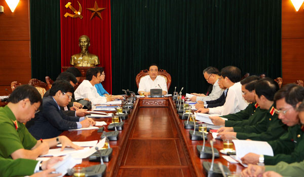 Thường trực Thành ủy họp khẩn với các ban, ngành, các lực lượng chuyên môn. Ảnh: Viết Thành |