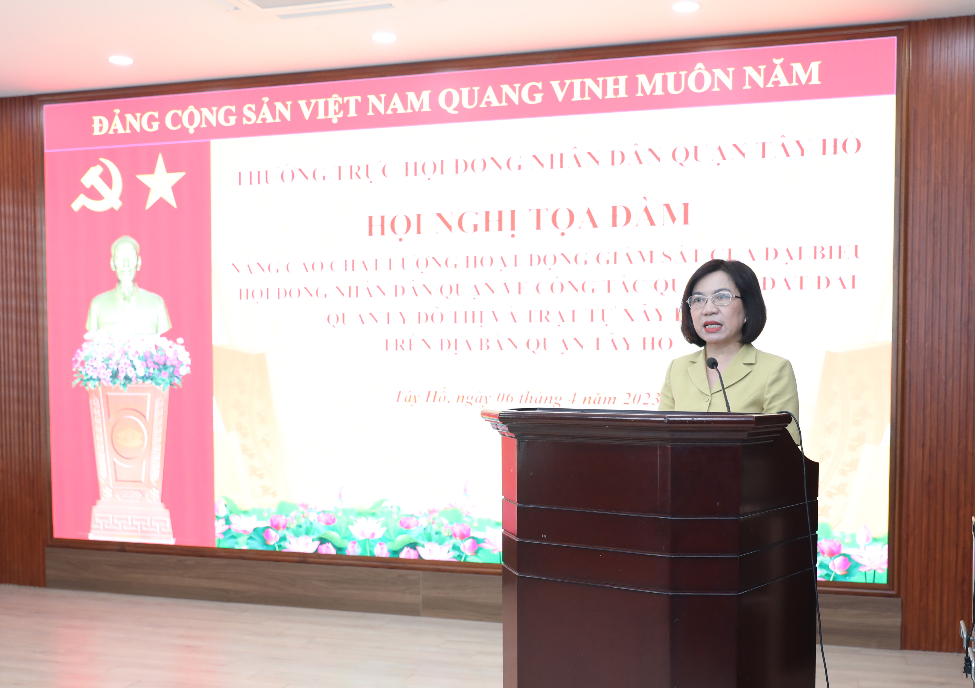 Nhằm nâng cao năng lực, hiệu lực, hiệu quả hoạt động của HĐND quận Tây Hồ gắn với thí điểm thực hiện mô hình chính quyền đô thị giai đoạn 2021 - 2026, chiều 6/4/2023, Thường trực HĐND quận tổ chức Hội nghị tọa đàm Nâng cao chất lượng hoạt động giám sát của đại biểu HĐND quận về công tác quản lý đất đai, quản lý đô thị và trật tự xây dựng trên địa bàn quận.