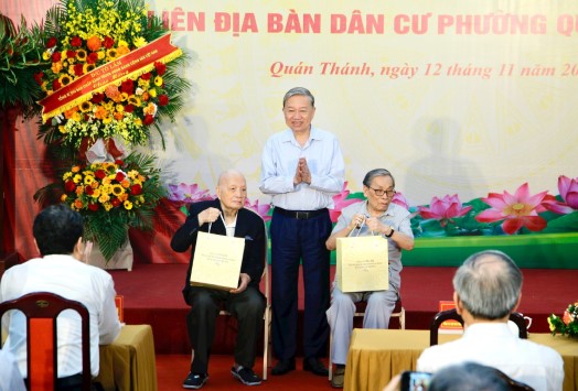 Thay mặt lãnh đạo Đảng, Nhà nước, đồng chí Tô Lâm nhiệt liệt chúc mừng, biểu dương, đánh giá cao những thành tích, sự nỗ lực của Đảng bộ, chính quyền, quân và dân thành phố Hà Nội nói chung, quận Ba Đình, phường Quán Thánh nói riêng đã đạt được trong thời gian qua.