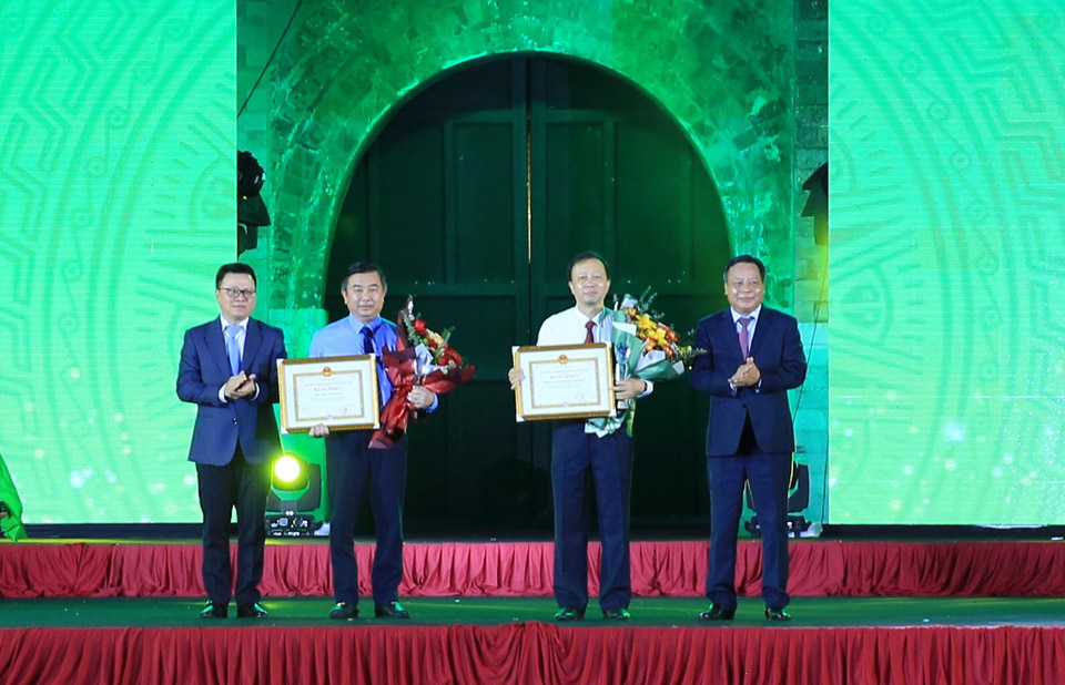 Ủy viên Thường trực Ủy ban Văn hóa, Giáo dục của Quốc hội Bùi Hoài Sơn và Phó Chủ tịch UBND thành phố Hà Nội Chử Xuân Dũng trao giải C cho các tác giả, nhóm tác giả.