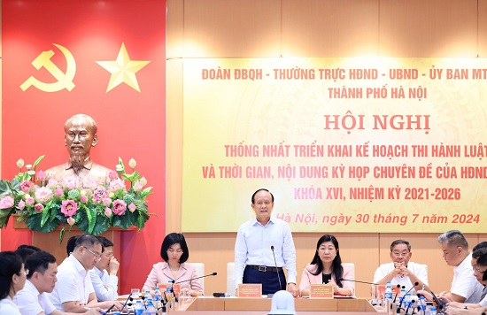 Sáng 30-7, Đoàn đại biểu Quốc hội, Thường trực HĐND, UBND, Ủy ban Mặt trận Tổ quốc Việt Nam thành phố Hà Nội tổ chức hội nghị thống nhất triển khai kế hoạch thi hành Luật Thủ đô và thời gian, nội dung kỳ họp chuyên đề của HĐND thành phố khóa XVI, nhiệm kỳ 2021-2026.