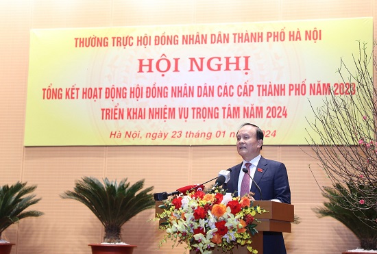 Nhấn mạnh năm 2023, mặc dù phải đối mặt với nhiều khó khăn, thách thức, tuy nhiên, Thành phố đã đạt được những kết quả hết sức nổi bật trong phát triển kinh tế - xã hội, Chủ tịch HĐND Thành phố khẳng định, trong những kết quả, thành tựu chung của Thành phố, có sự đóng góp rất tích cực, trách nhiệm, quan trọng của HĐND các cấp Thành phố. Trong năm 2023, HĐND các cấp đã tiến hành sơ kết giữa nhiệm kỳ, sơ kết mô hình tổ chức chính quyền đô thị, có nhiều nỗ lực phấn đấu, đổi mới về tổ chức, nội dung và phương thức, ngày càng nâng cao hiệu lực, hiệu quả, thực sự là cơ quan quyền lực nhà nước ở địa phương, đại diện cho ý chí, nguyện vọng và quyền làm chủ của Nhân dân, đóng góp quan trọng vào công cuộc xây dựng và phát triển Thủ đô.