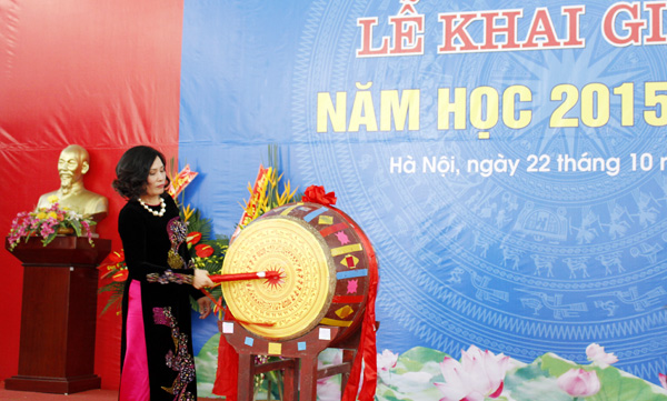 Bà Nguyễn Thị Thịnh, Hiệu trưởng Trường Cao đẳng Y tế Hà Đông đánh trống khai giảng năm học mới