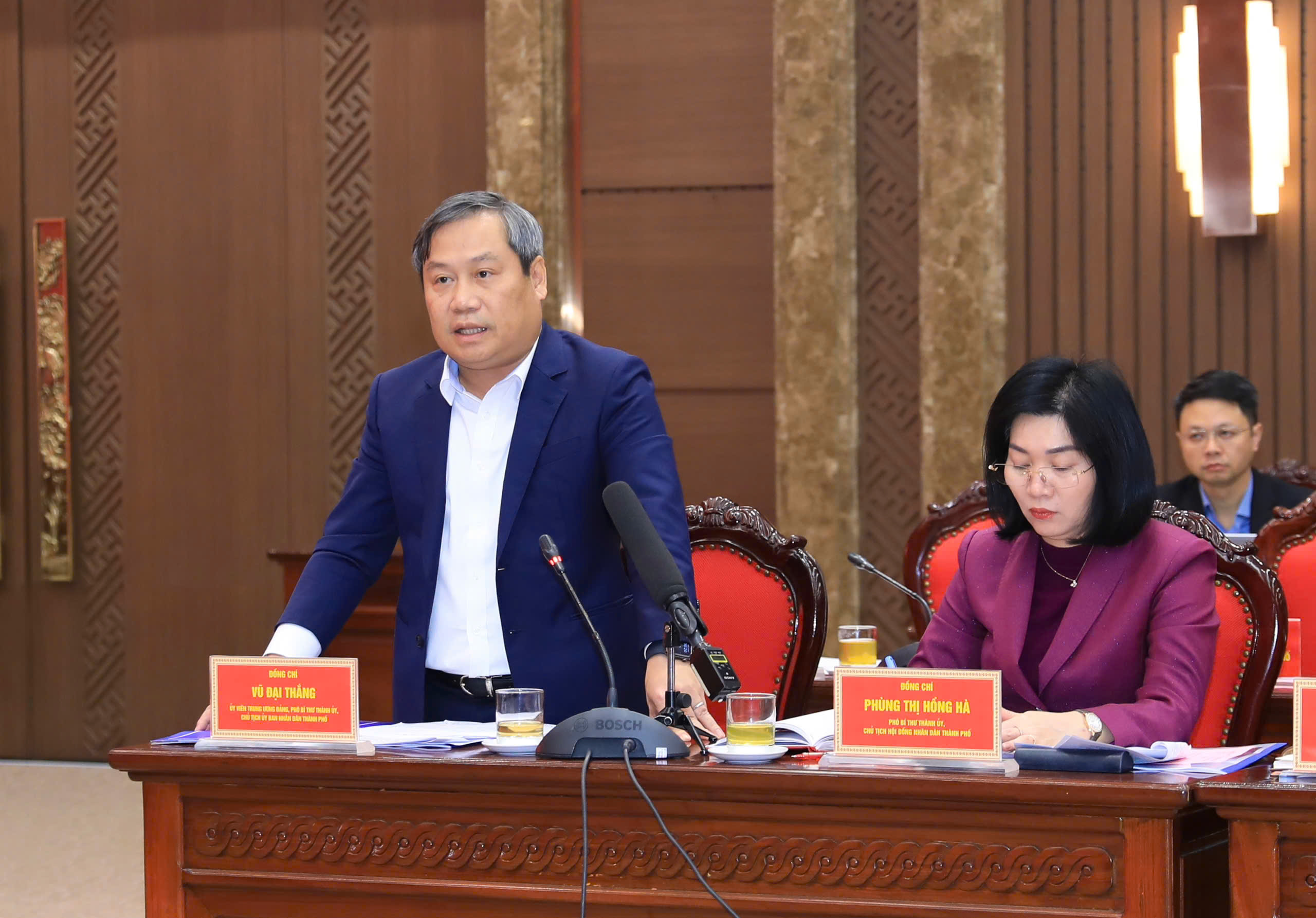 Chủ tịch UBND Thành phố Vũ Đại Thắng chủ trì phần thảo luận tại hội nghị.