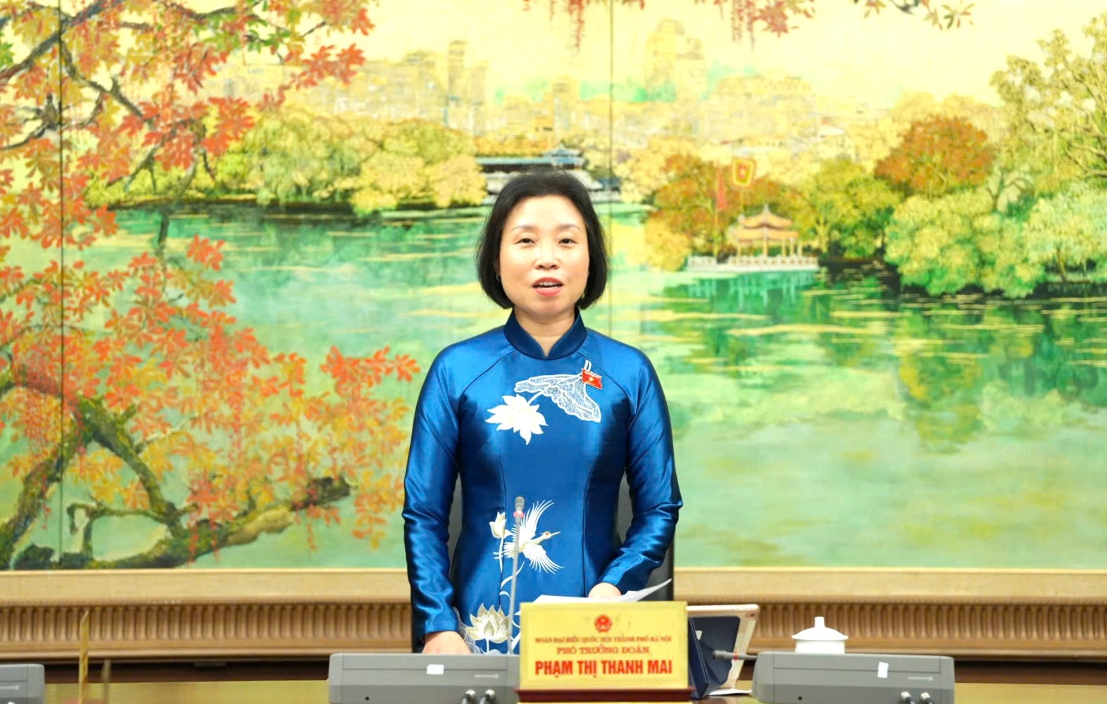 Phó Chủ tịch HĐND thành phố, Phó Trưởng đoàn đại biểu Quốc hội thành phố Hà Nội Phạm Thị Thanh Mai phát biểu.