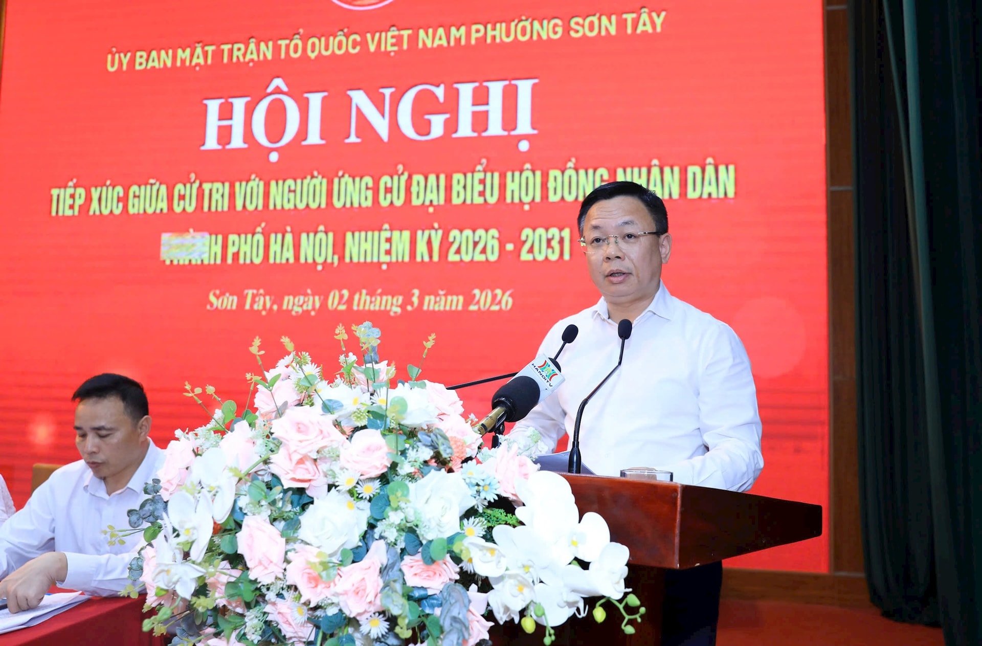 Sáng 02/3/2026, các ứng cử viên đại biểu HĐND thành phố khóa XVII (nhiệm kỳ 2026-2031) - Đơn vị bầu cử số 14 đã tiếp xúc cử tri để báo cáo chương trình hành động và thực hiện vận động bầu cử. Hội nghị thực hiện bằng hình thức trực tiếp tại phường Sơn Tây và kết nối trực tuyến đến phường Tùng Thiện và xã Đoài Phương.