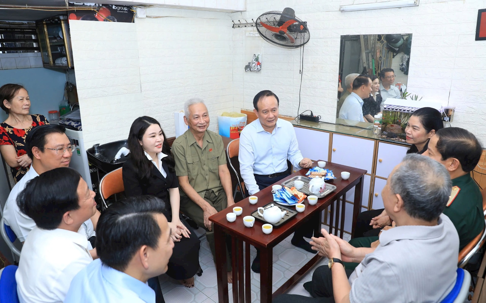 Sáng cùng ngày, Đoàn công tác của thành phố cũng tới thăm, tặng quà gia đình ông Đỗ Bình Tiến (sinh năm 1951) ở phố Lò Đúc, phường Hai Bà Trưng. Ông Tiến là thương binh 41%, từng tham gia chiến đấu tại chiến trường Lào năm 1972 và bị thương. Đến năm 1974, ông Tiến tiếp tục tham gia chiến dịch giải phóng miền Nam.